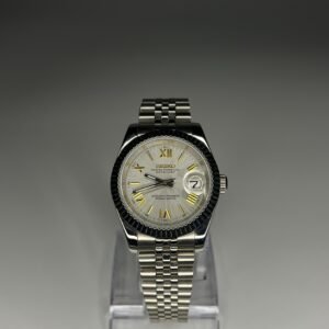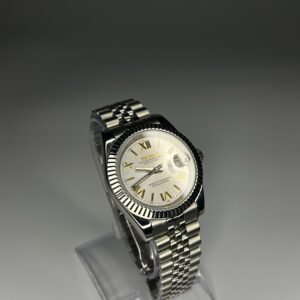 This elegant Datejust-style watch features a pristine white dial with gold Roman numeral indexes, perfectly paired with a polished Jubilee bracelet for timeless sophistication. The NH35 automatic movement ensures accurate and dependable performance, while the date function adds practicality to its refined design. Ideal for both formal occasions and everyday wear, this watch is a harmonious blend of classic luxury and modern reliability.