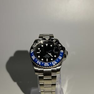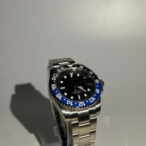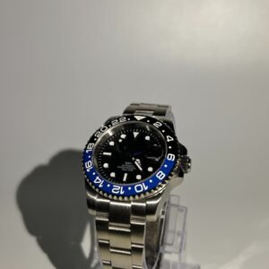 A “Batman” mod watch featuring a black and blue 24-hour bezel, a stark black dial, and a stainless steel case, powered by the reliable NH35 automatic movement.