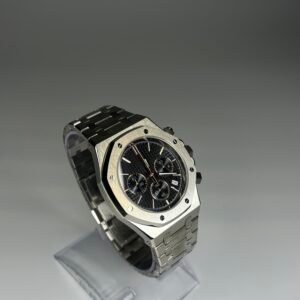 The brushed stainless steel case flows seamlessly into an integrated bracelet, creating a strong, modern silhouette. A textured black grid dial adds depth and contrast, complemented by applied indices, luminous hands, and well-balanced sub-dials for clear legibility. Chronograph pushers provide intuitive timing control, while the discreet date window enhances everyday usability.
