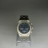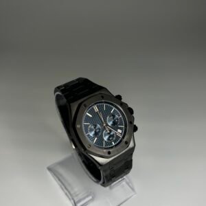 The black stainless steel case and integrated bracelet create a strong, modern profile, while the textured dial and sub-dials add depth and visual balance. Applied hour markers and luminous hands ensure clear readability, and the chronograph pushers allow precise timing functionality.